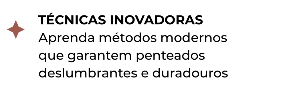 No meu curso, trago técnicas fáceis e acessíveis que transformarão seu atendimento, além de métodos elaborados que vão aprofundar seu conhecimento em penteados.